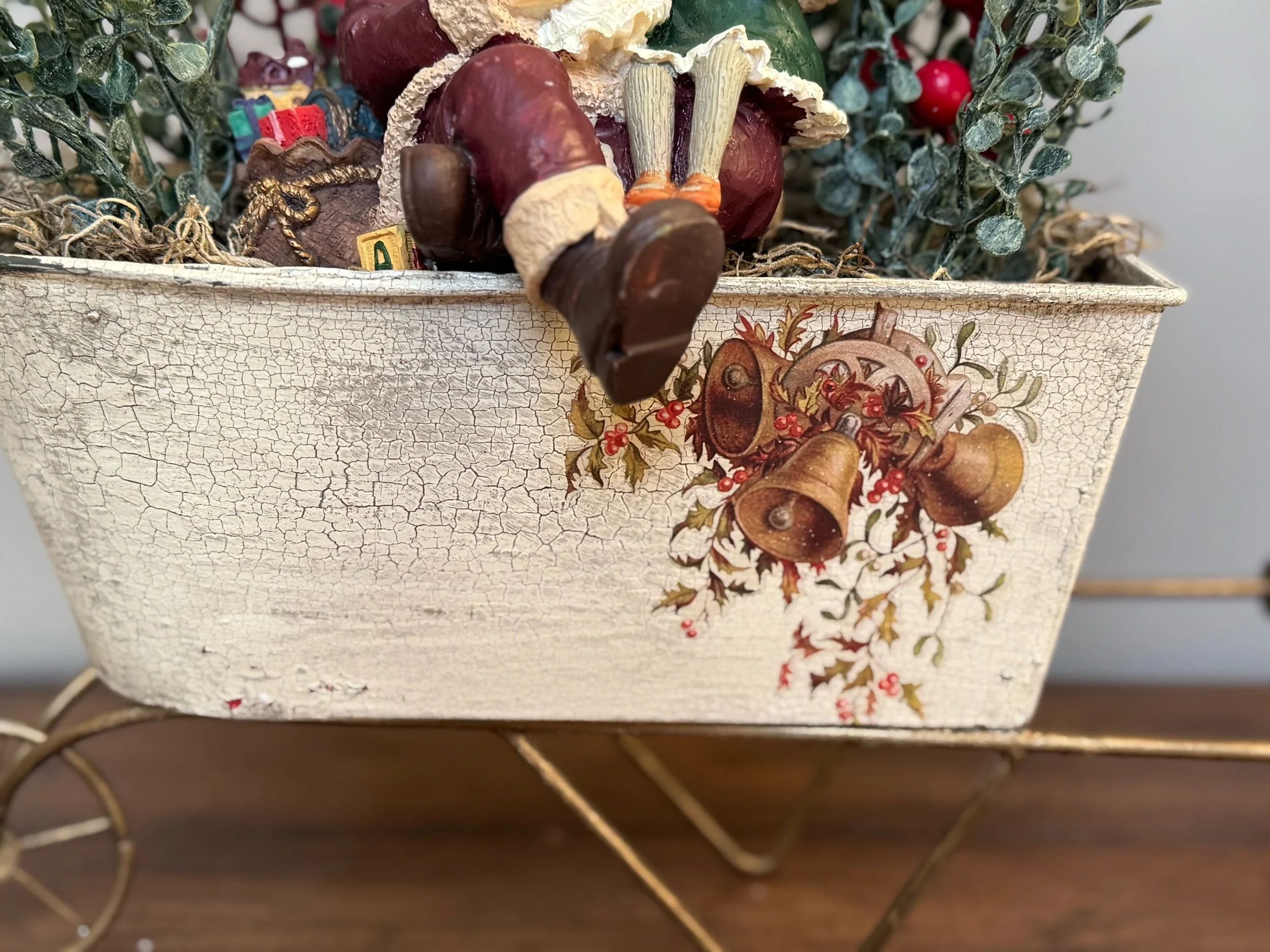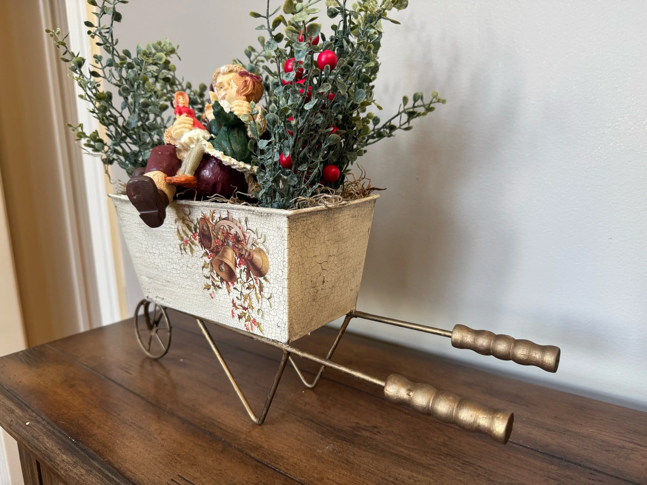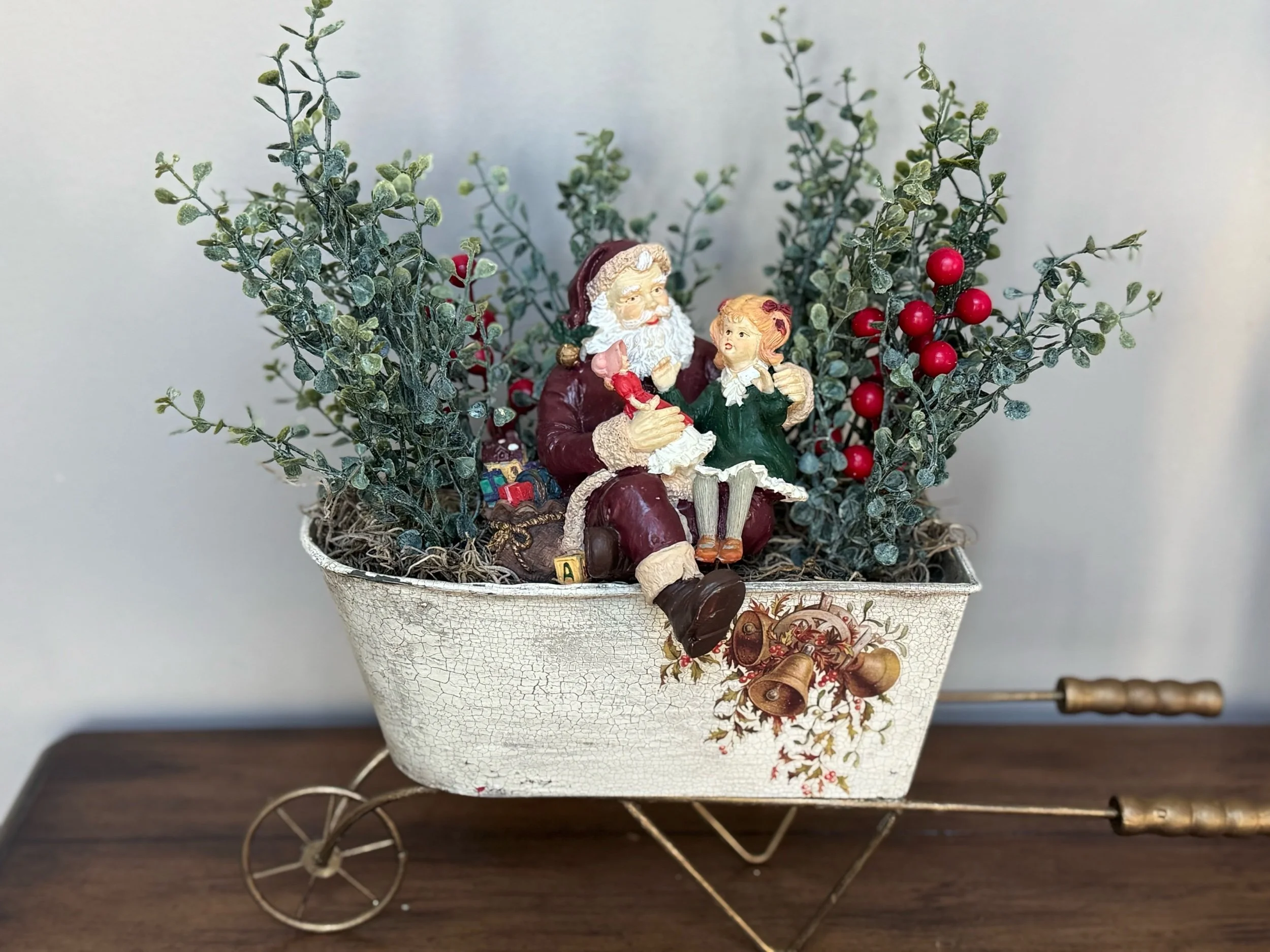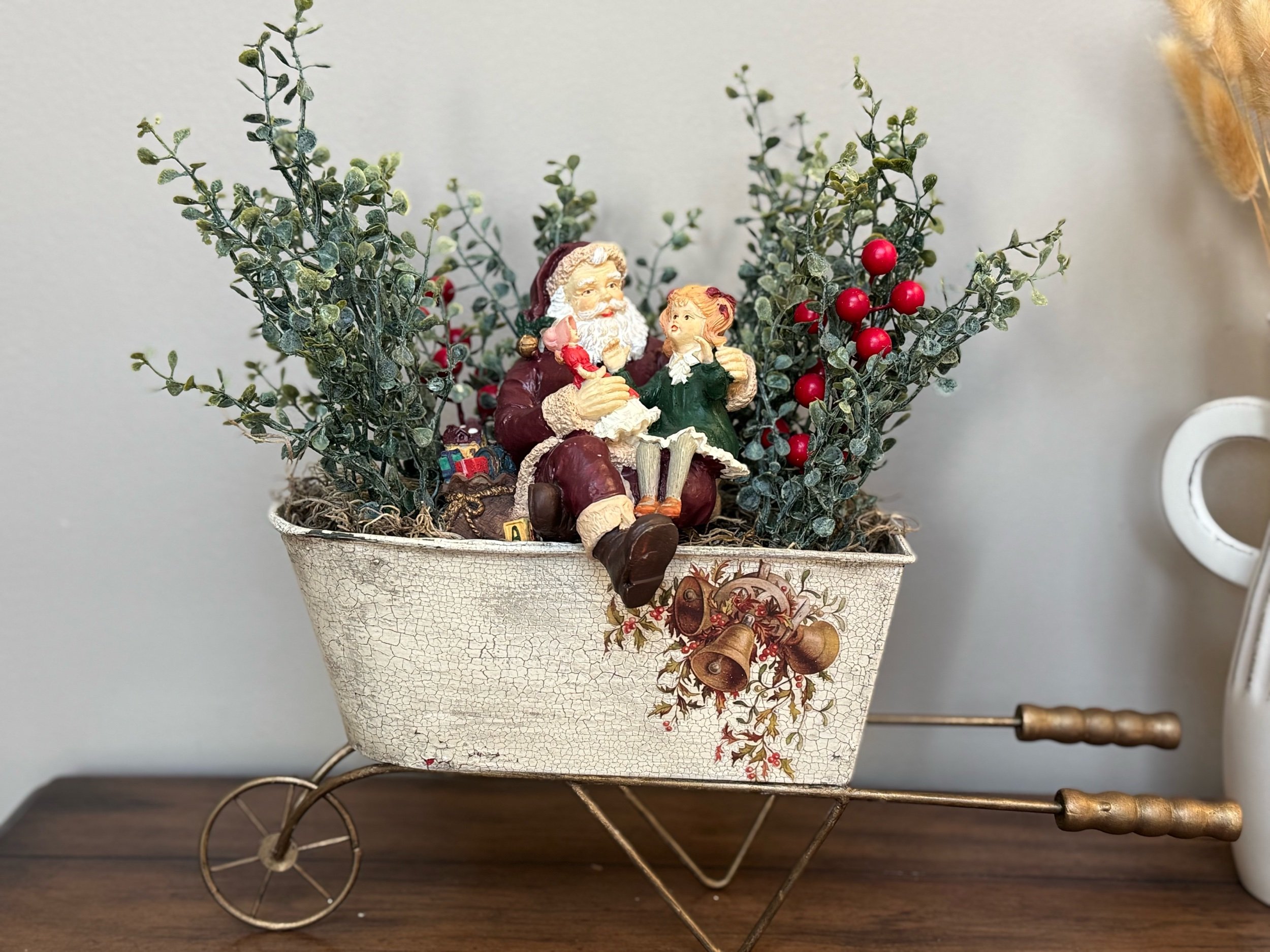 Upcycled metal wheel barrow with vintage Santa stocking holder
